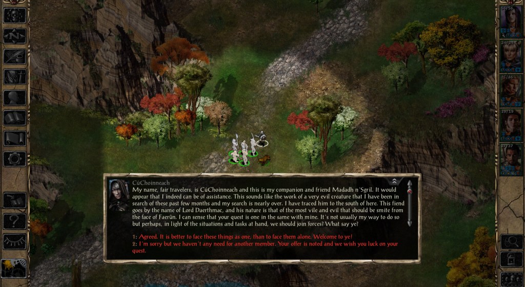 The author, CúChoinneach himself, appears as a companion. That’s just Gaelic for Kenneth. He’s a cool, mysterious elven ranger with loyal wolf companion and a grudge against a vampire. Once you kill that vampire, he’s out of there, so I appreciate the brevity of this Kenneth-Drizzt amalgamation. Hey, no judgement — it was the early 2000s.