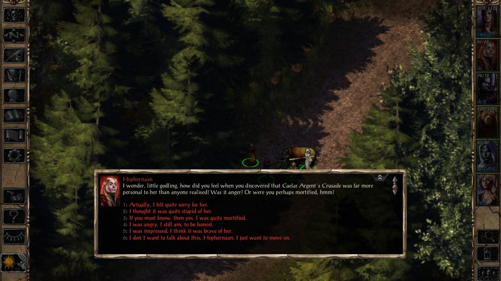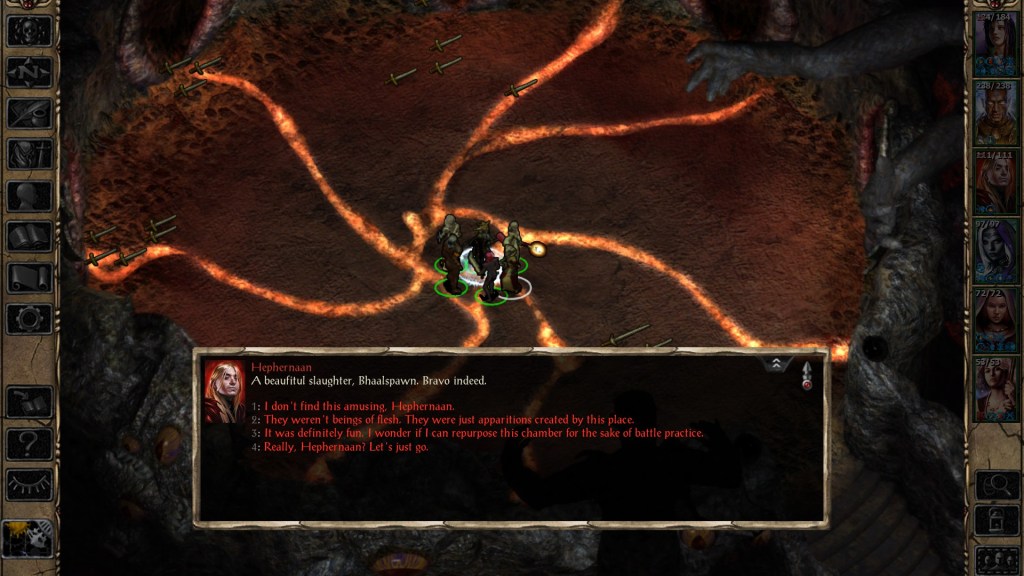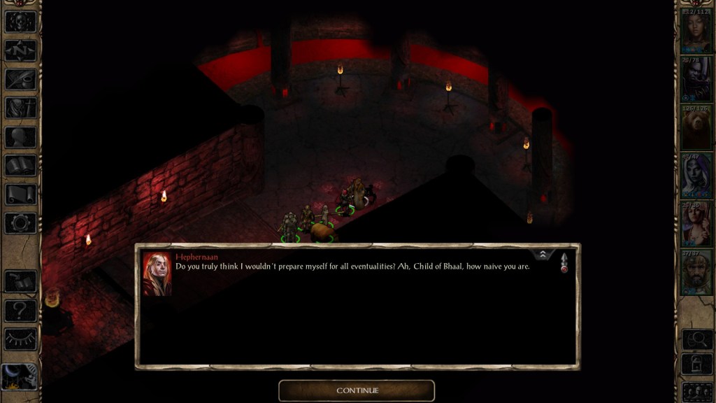 Before the final battle in Throne of Bhaal, Hephernaan will give you a choice that can yield around 200,000 EXP. It’s nice if you’re under-leveled, and doing so will give Hephernaan a different epilogue slide. A somewhat happier ending.