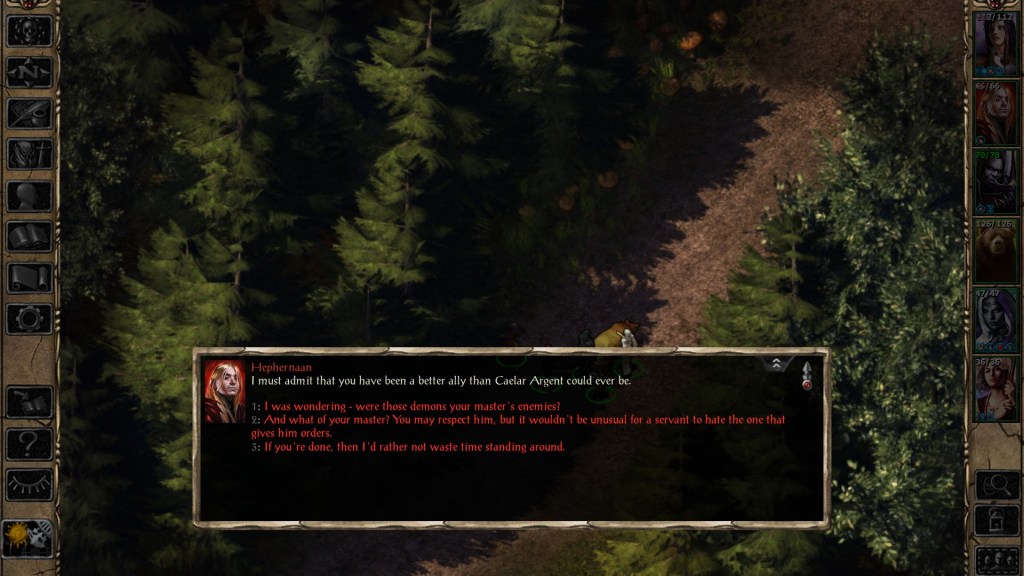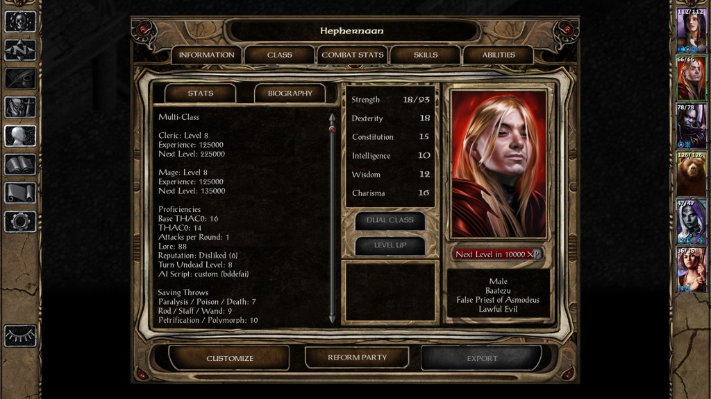 We’ll go over the class in a moment, but it’s safe to say that Hephernaan is an absolute monster, though not particularly overpowered. He won’t be the “most powerful” member of your party in comparison to Anomen, Jaheira, or any of the pure arcane spellcasters, but he’s still fantastic.
