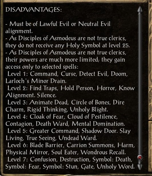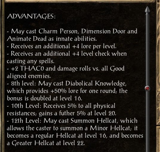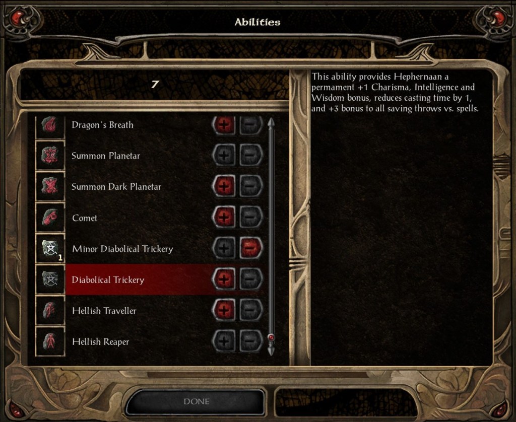 Intelligence and Wisdom are where Hephernaan really takes a hit, and while I may not consider it to be accurate considering how downright manipulative and conniving Hephernaan is in this mod, it also serves as a balancing force against Hephernaan’s already amazing abilities. His mage spells will never be his focus, and his cleric spells are mostly offensive. Everything about him is begging you to put him on the front lines, other than his limited weapon proficiency.