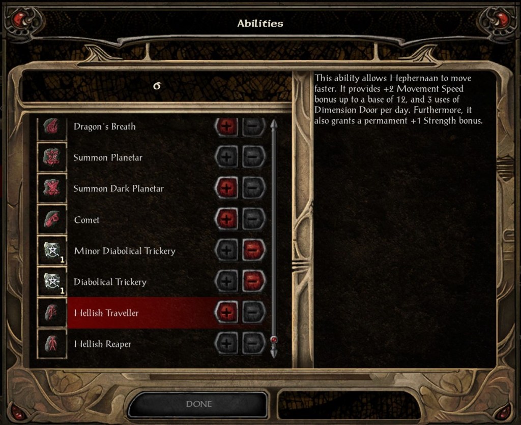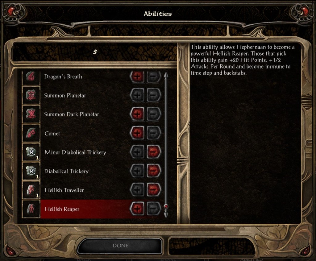 Hellish Reaper is insane. Immunity to time-stop is one of the best abilities in the game that previously only a couple of powerful enemies had access to. Immunity to backstab is also great, but by the point that you get HLAs there won’t be many thieves out to get you anymore. +20% to hitpoints will allow Hephernaan some more survivability on the front lines and +1/2 attack per round is a welcome buff.