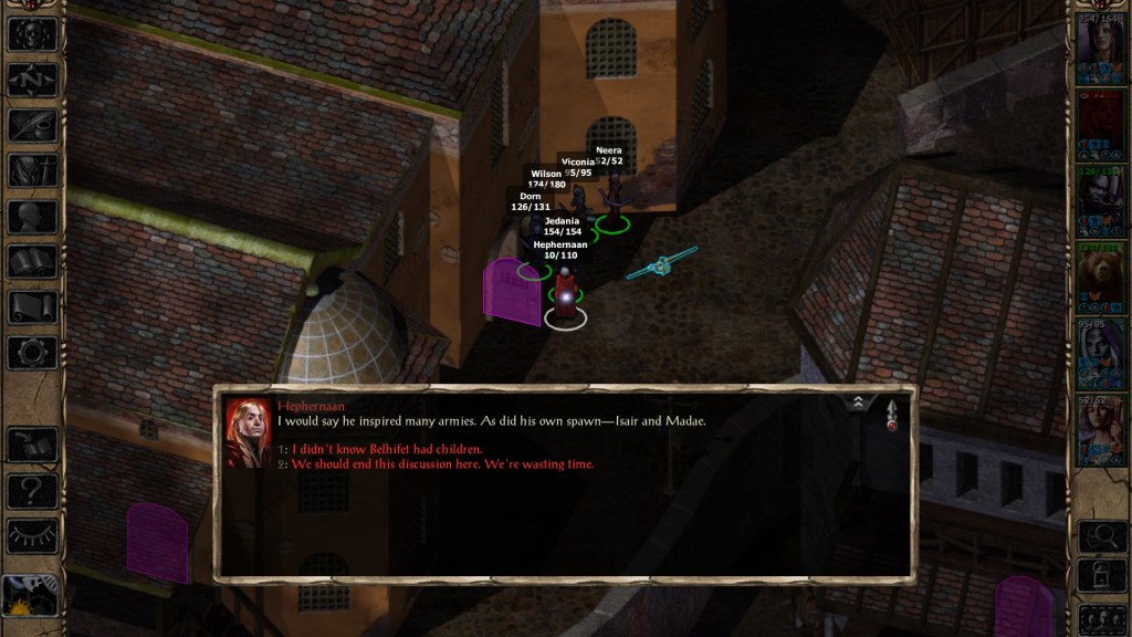 Also included in this history lesson is the tale of Isair and Madae, Belhifet’s children in Icewind Dale 2. Hephernaan compares their story to your own. It’s a sad tale, best experienced by witnessing it in its full glory in IWD2, and Hephernaan’s story only count as minor spoilers. It’s a very well done conversation, though, and I appreciated its inclusion immensely.