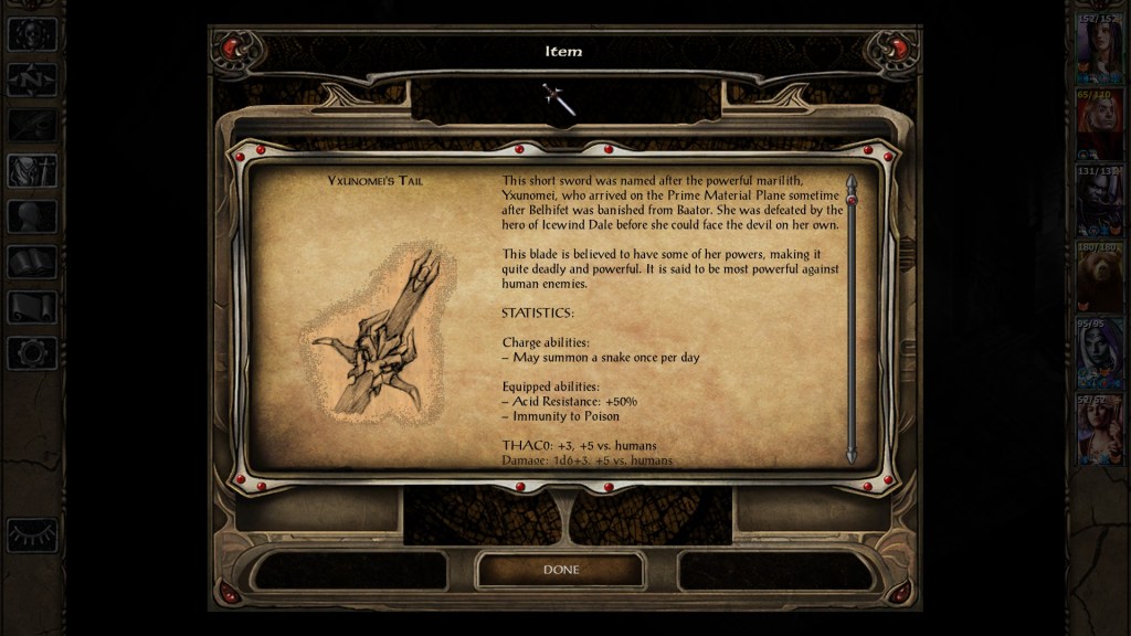 Yxunomei’s Tail is a callback to one of the bosses of Icewind Dale. It allows you to summon a large snake once per day and grants 50% Acid Resistance, as well as poison immunity. Functionally, its a +5 weapon against humans, otherwise it’s +3. It’s not great, and it will cost you 2 hit points, which you will permanently lose. You can sell it if you don’t end up using it, too.