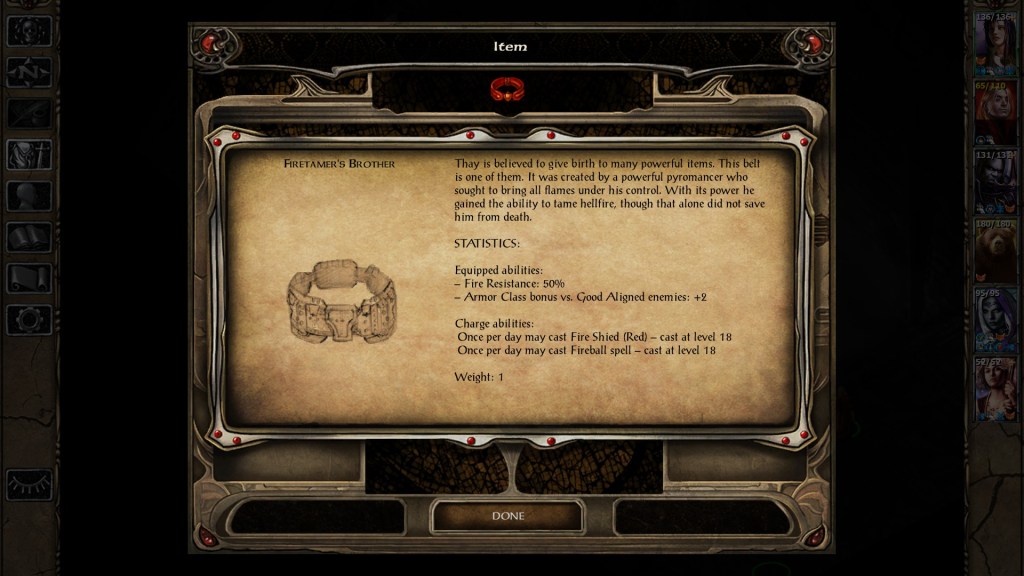 Firetamer’s Brother is a powerful belt that grants a stackable 50% Fire Resistance, one of the best resistance types in the game. Having 100% Fire Resistance is incredibly valuable in Baldur’s Gate 2 and that automatically makes this an amazing item. The bonus AC against good characters is nice if you’re evil, and the bonus spells are cast at a pretty high level. It will cost you 4 hit points.