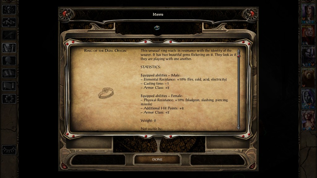 Ring of the Dual Origin is a ring that changes its effect based on the wearer’s gender. Male wearers receive 10% elemental resistance, -1 casting time, and +2 bonus to AC. The natural pick to receive these benefits would be Haer’Dalis, who already has innate elemental resistances, or Edwin, who could certainly benefit from all of these bonuses.