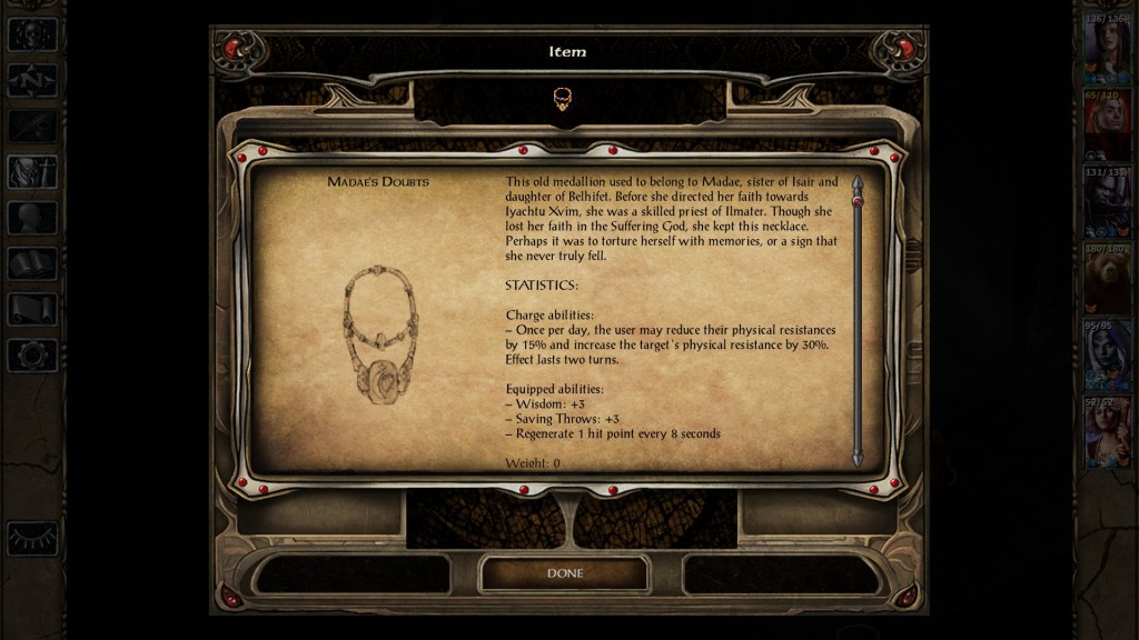 Madae’s Doubts once again calls back to Icewind Dale 2 and is an incredible item. It’s ability to allow an ally a temporary 30% physical resistance at the cost of 15% of your own is extremely powerful, making it a good fit for a backline character who can make use of the +3 Wisdom, like Viconia, Cernd, or Aerie. It will cost you either 1 point of Intelligence, Wisdom, or Charisma.