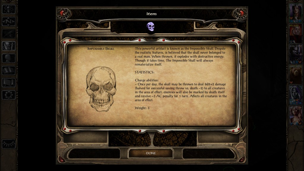 The Impossible Skull is an interesting item. It is a throwable item, usable once per day, and after dealing 8d8+2 damage similar to a fireball spell, it gives all creatures hit a -3 debuff to Armour Class. This is really powerful, if a bit situational. Crowded rooms are a great opportunity to use this, and I averaged around 31 damage per use on creatures that failed the saving throw. The skull will cost you 2 hit points.