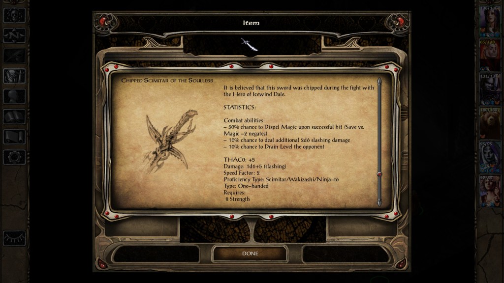 The Scimitar of the Soulless is an incredibly powerful weapon that you obtain damaged. The chipped version has 50% chance to dispel on hit while the restored version always dispels. The restored version also increases the chances of dealing extra damage and inflicting level drain on the target. The chipped version does 1d6+5 damage and the restored does 1d8+5 damage. Either of these are incredibly powerful, and the restored version is one of the most powerful items in the game. However, there is a reason not to restore it. It will cost you either 1 point of Strength, or 1 point of Constitution.