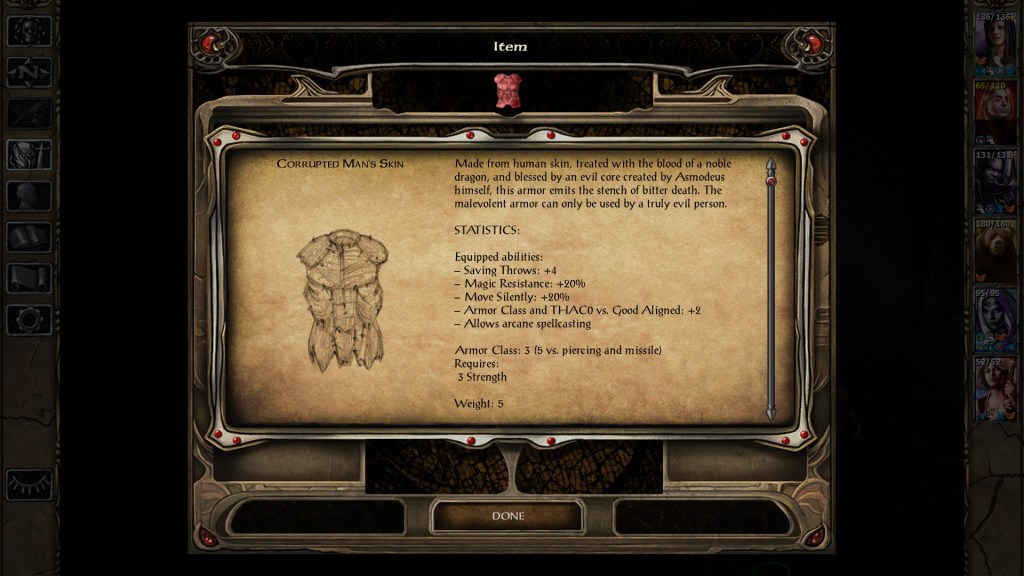 Corrupted Man’s Skin is the corrupted version of Human Flesh+5, and allows spellcasting while the caster is wearing it. This is a pretty major upgrade and gives more options in how you want to use it. It also grants an additional +2 bonus AC and THAC0 against good-aligned creatures.