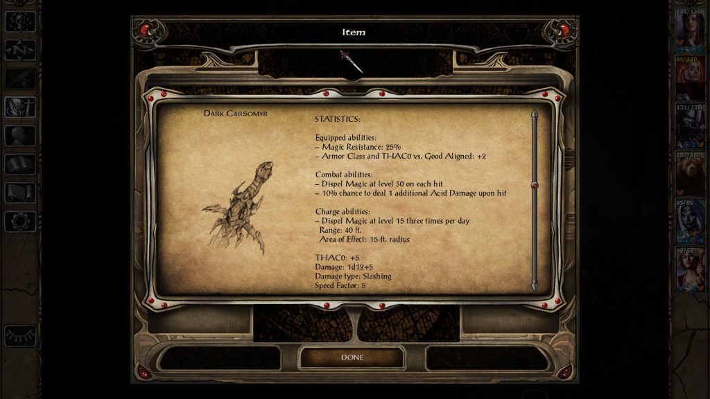 Dark Carsomyr halves the original 50% Magic Resistance on the sword, and grants the wielder the same AC and THAC0 bonuses as the Human Flesh. It also has a 10% chance to do 1 acid damage upon hit, which is… basically useless. The ONLY reason you would corrupt this item over any other is because doing so allows any evil martial character to wield the weapon. Paladins are now unable to use it. You could now give this sword to Sarevok, or Korgan.