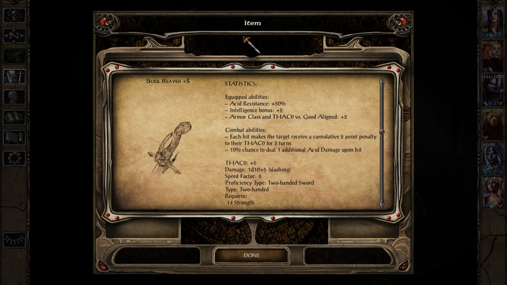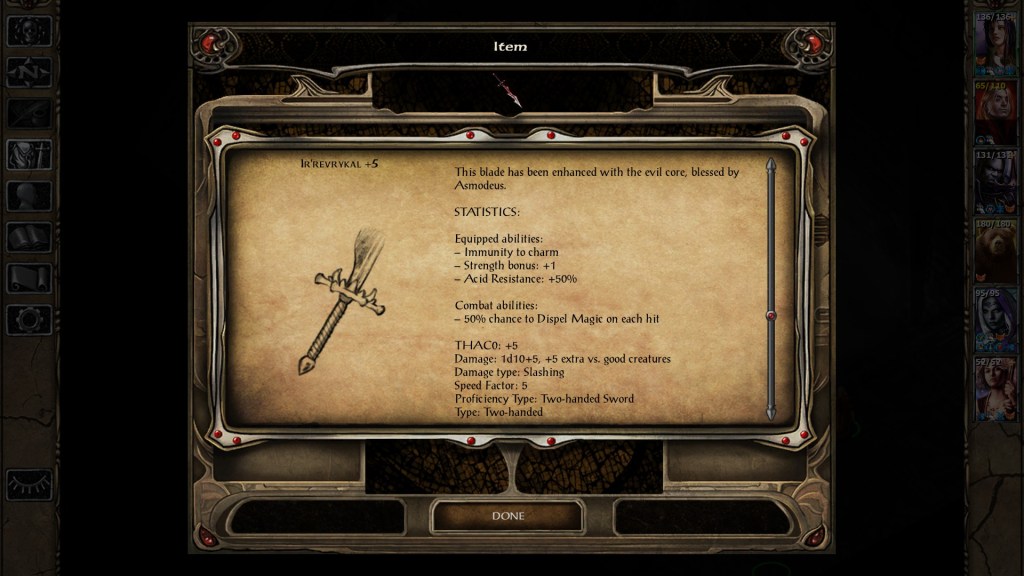 Ir’revrykal+5 is the enhanced version of the Unholy Avenger, the original of which was added in the Enhanced Edition. This makes the weapon actually good. A +1 Strength bonus has been added, 50% Acid Resistance, and an additional +5 damage to good creatures, for a total of 1d10+10 slashing damage. The sword still dispels on 50% of hits and it cannot be resisted, and the curing ability on hit is gone (which is good). This is a great option for Dorn to use now, since it’s only usable by Blackguards.