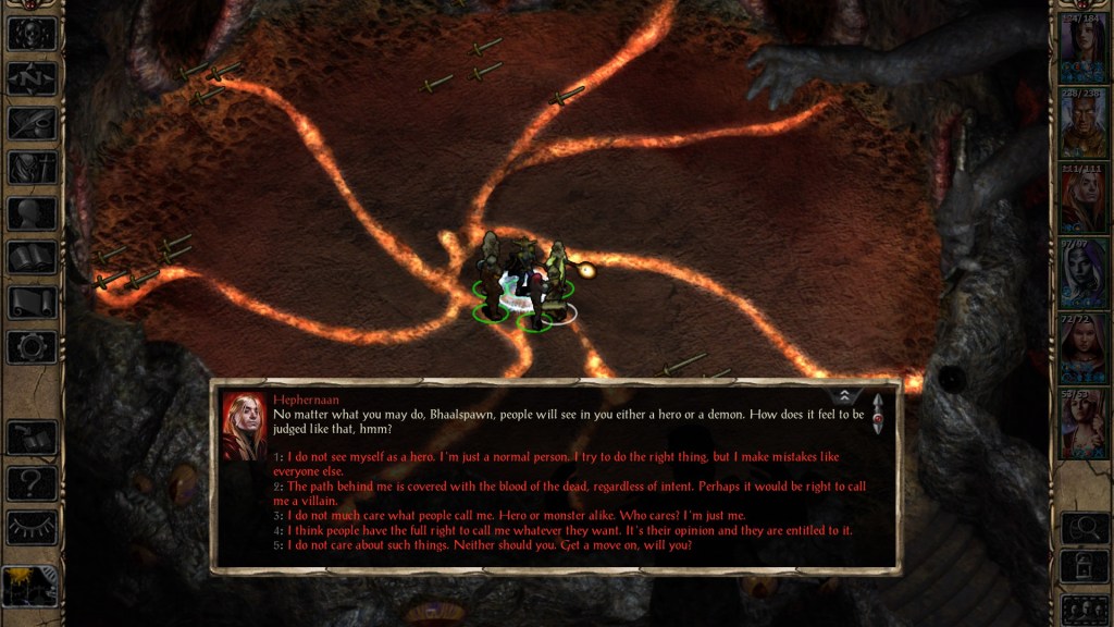 Given that Hephernaan questions you so much, it offers some great roleplaying opportunities to solidify your character’s personality and beliefs. Of course, Hephernaan is evil, and will always attempt to twist your words to the darker meaning he may interpret, but you can also agree with him and his philosophies all the way. That may not be the best way to gain his respect, however.