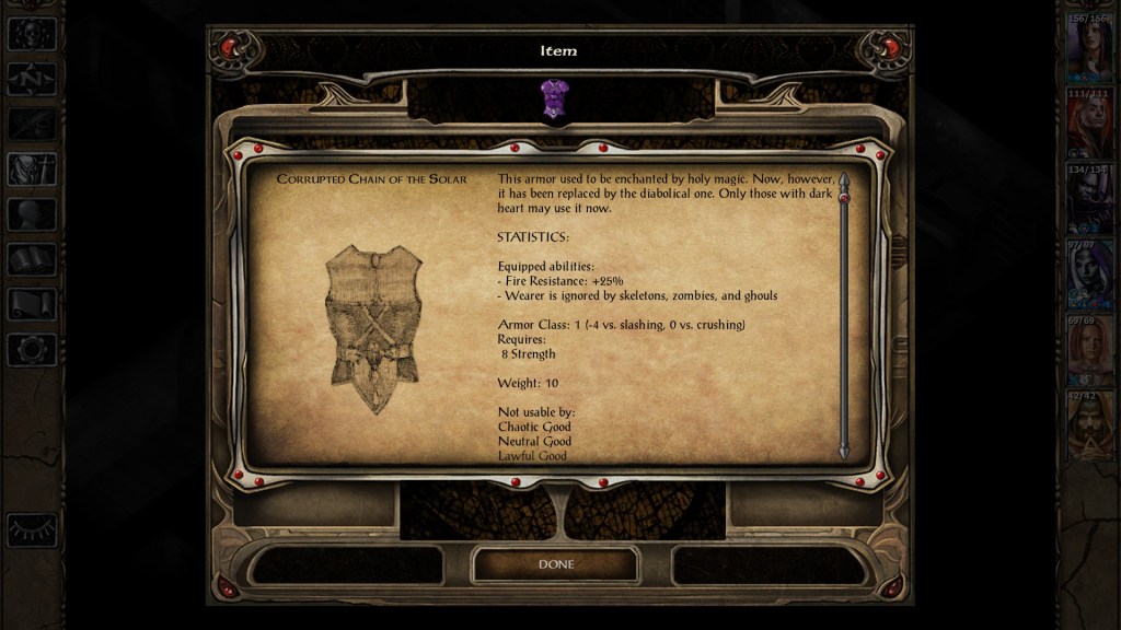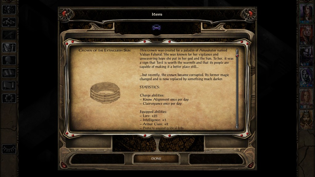 Crown of the Extinguished Sun is functionally a helmet for mages, and its the best one in the game. The charge abilities of Know Alignment and Clairvoyance are very RP-ish, but the equipped abilities are nothing to sneeze at. +25% to lore is really nice as it’s a percentage bonus and will increase over time, and +1 to Intelligence is great. A +2 bonus to AC and immunity to critical hits is fantastic… but it’s only usable by evil characters. It’s a great item, and it’s a shame, but it makes sense. This is also crossmod content. Hephernaan interacts with the Foundling, Innershade, and Of Classes and Heirlooms mods.