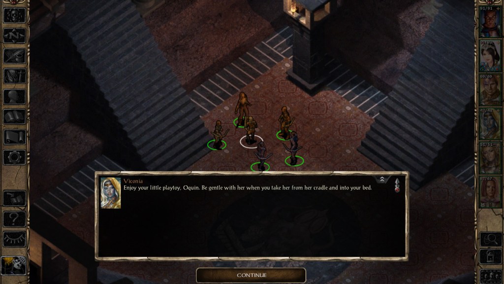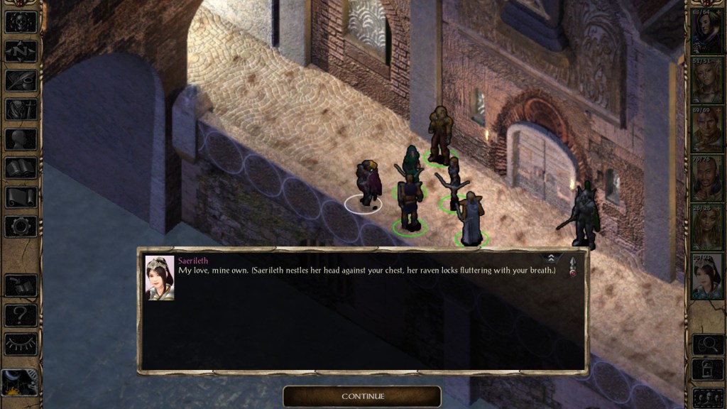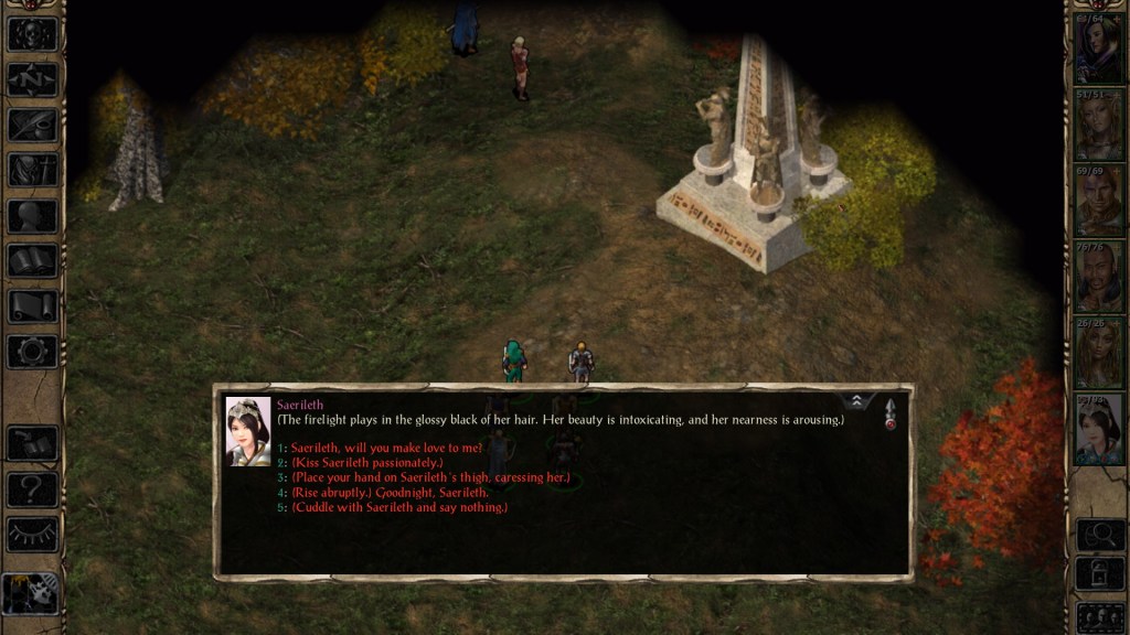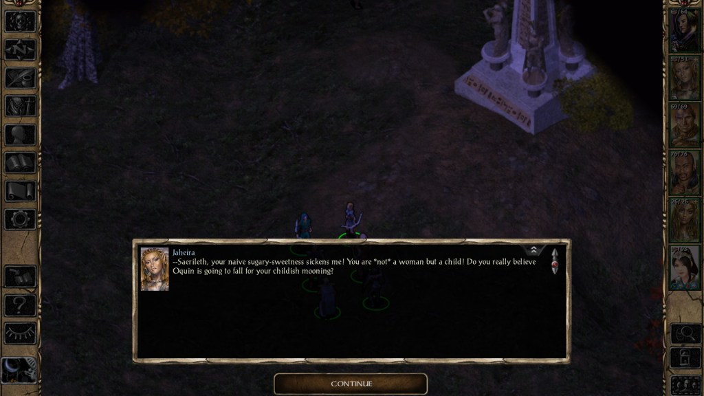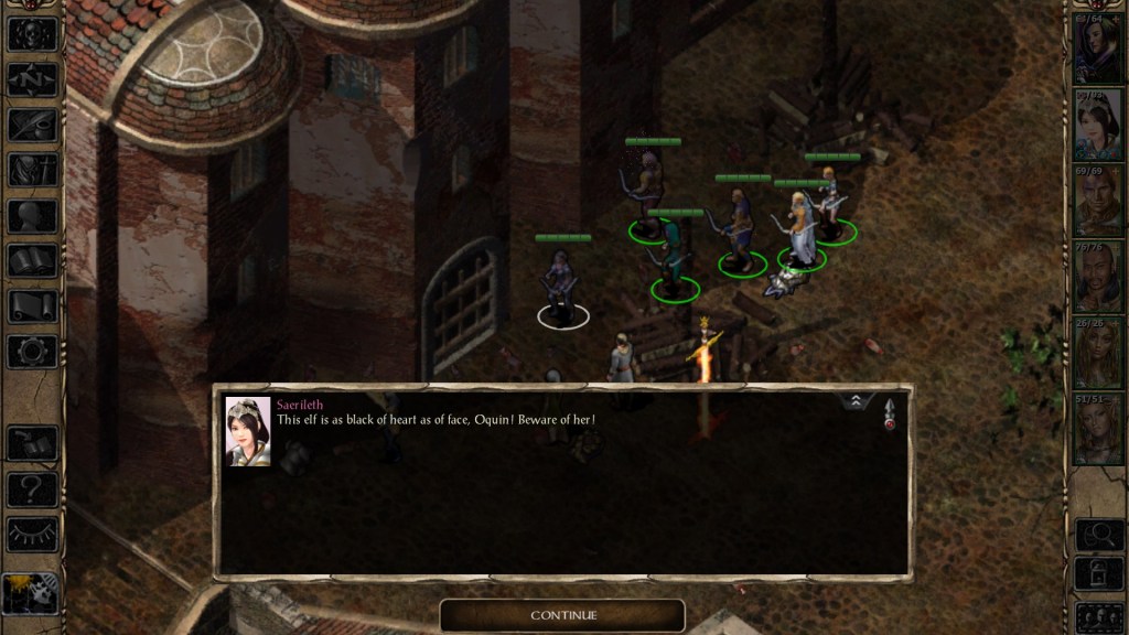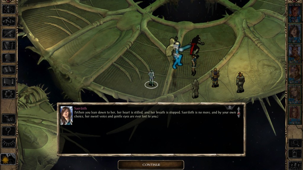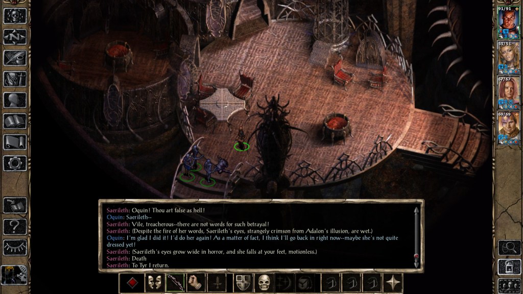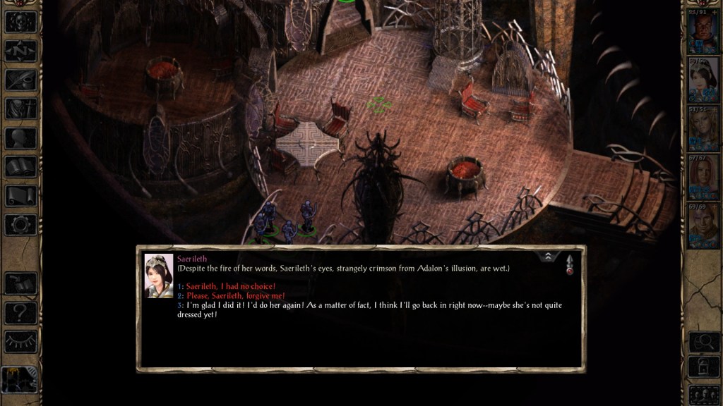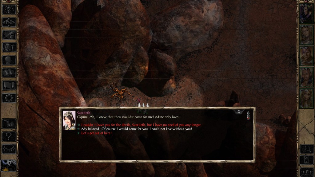 Saerileth is, perhaps fortunately, completely irredeemable. She completely breaks the immersion of Baldur’s Gate 2, sticking out like a sore thumb. She interjects so often that sometimes it feels like the story is about her.
