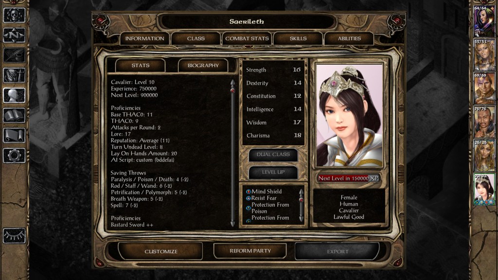 You may or may not be aware of Saerileth’s position in the Baldur’s Gate community, but to sum it up, this mod is one of the most-downloaded BG mods out there. Saerelith is a human Cavalier, and is the epitome of lawful stupid. With no hyperbole, this mod is also one of the worst pieces of media I have consumed in my entire life. The only reason to play this mod is for the meme, for a history lesson, or out of self-hatred.