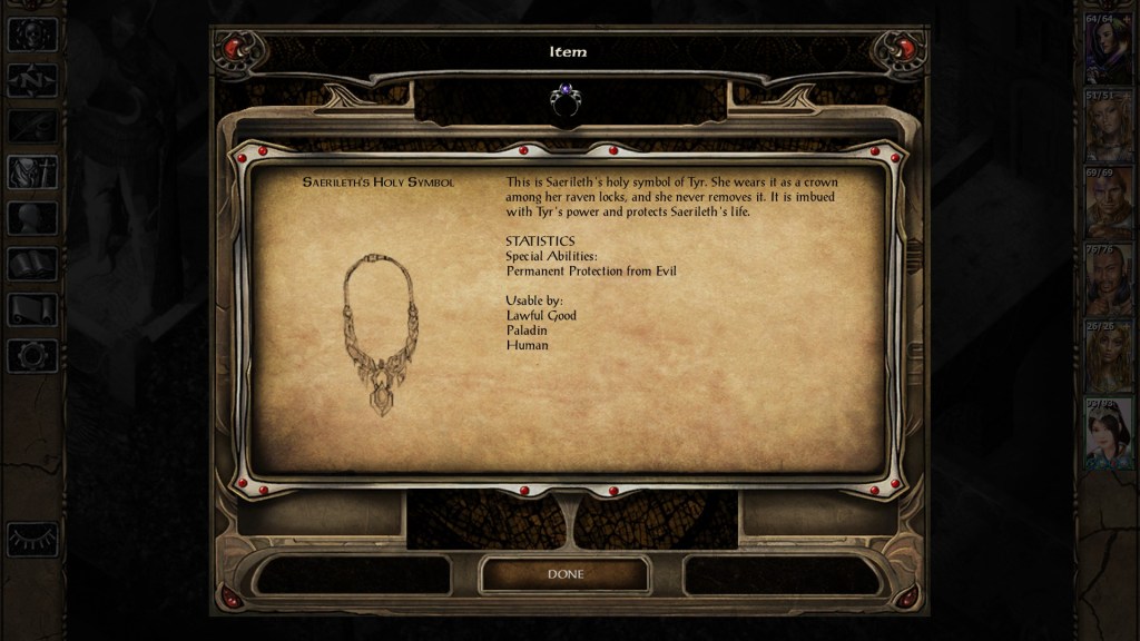 Saerileth’s Holy Symbol is terrible, even if it’s just an RP item. It doesn’t protect from critical hits and it can’t be removed, so Saerileth is completely vulnerable to critical hits, meaning that she will die very consistently. Thus the only reliable thing you can have Saerelith do is be a ranged fighter. As a Cavalier, though, that will prove difficult.