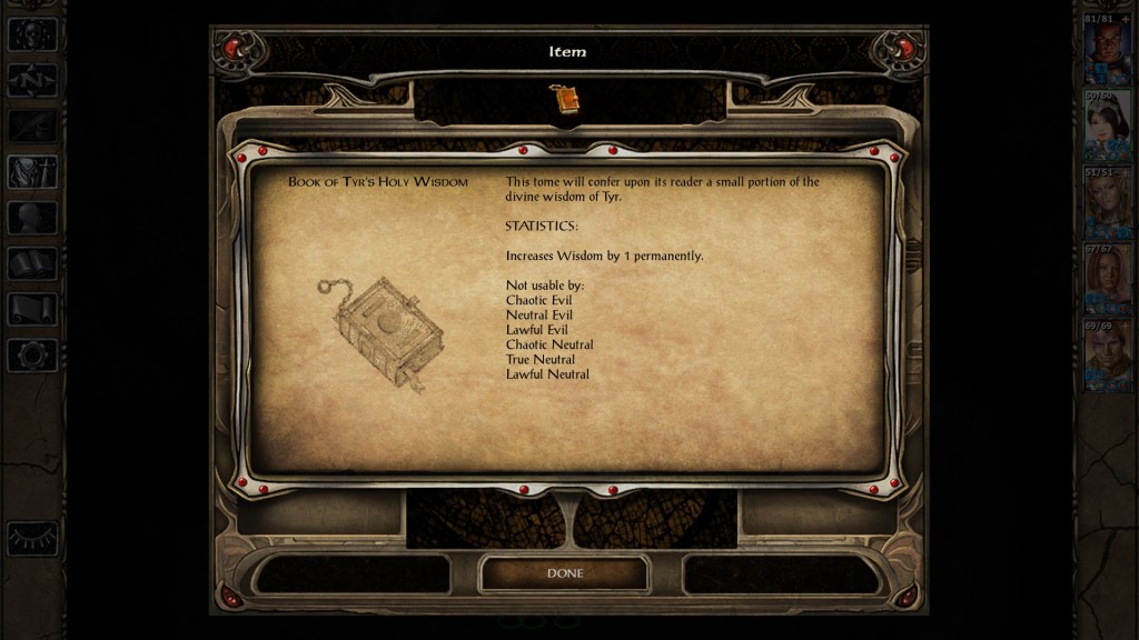 Late in SoA, Saerileth will receive two tomes. One will increase wisdom, and the other will increase charisma. Only good characters may use them. I don’t see any practical purpose for these except for increasing Anomen’s wisdom to 17 if he’s been knighted.