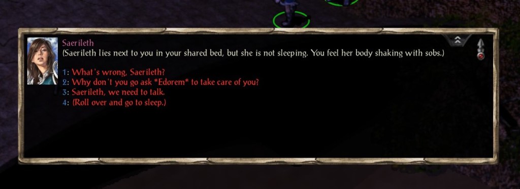I have an intense dislike of media that romanticizes codependent relationships and Saerileth is the worst of the worst in that regard. Much of the player-initiated dialogue with her runs along the lines of “Saerileth, I live for you,” or “You are my life.” That’s not healthy!