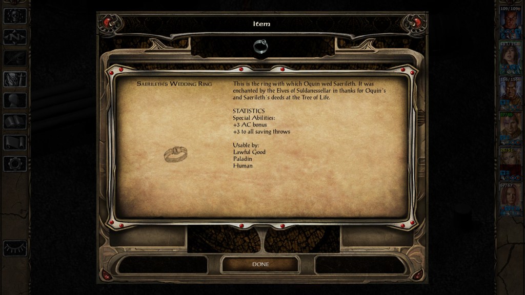 Saerileth’s Wedding Ring is received after you marry her at the end of SoA. It’s the same as a Ring of Protection +3, but it can only be used by paladins. You could give it to Keldorn and he would be able to wear it. The ring does stack with magical armour.