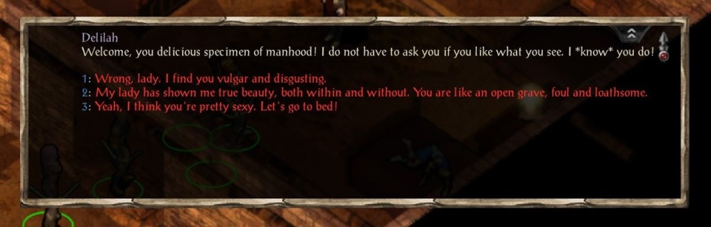 She is an author’s interpretation of a perfect person – if the author in question had the emotional maturity of a 15 year old. Saerileth exists only to be Tyr’s slave and to be a wife to the player character. There are many, many dialogues that focus on her age in relation to the player character’s – and how inappropriate it is for the two to be in a relationship.