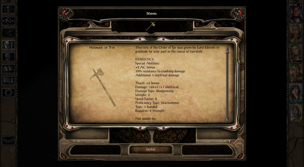 The Hammer of Tyr is an item that Edorem gives you as a reward for Saerileth’s kidnapping quest. It’s basically a worse version of Defender of Easthaven. Not the worst warhammer in the game, but definitely not the best.