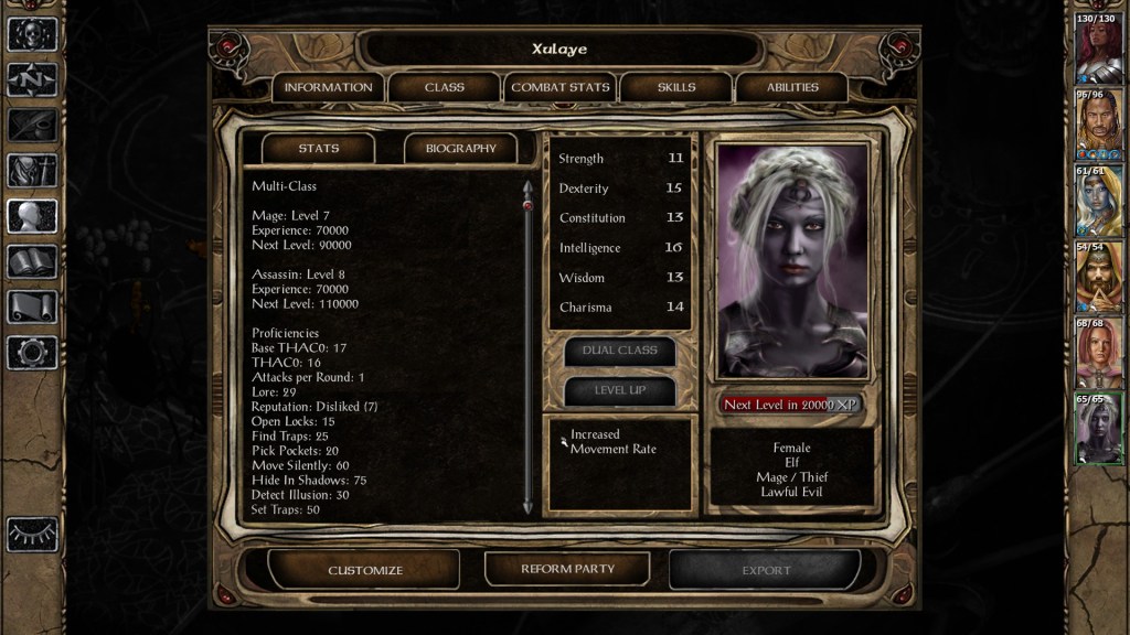 She has a very mediocre stat spread, with low strength that hurts her backstab potential, and low constitution that results in a pitiful amount of HP. What hurts the most, however, is that Xulaye will start with 7 levels of Mage and 8 levels of Assassin regardless of your current experience level.