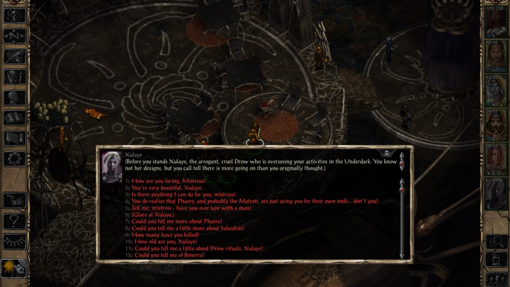 Throughout your travels in the Underdark, Xulaye will initiate a series of four conversations with you. She’ll start some light banter about the city and your reasons for coming to Ust Natha — as light as banter can be when you’re chatting with a drow — before eventually revealing that she knows your secret.