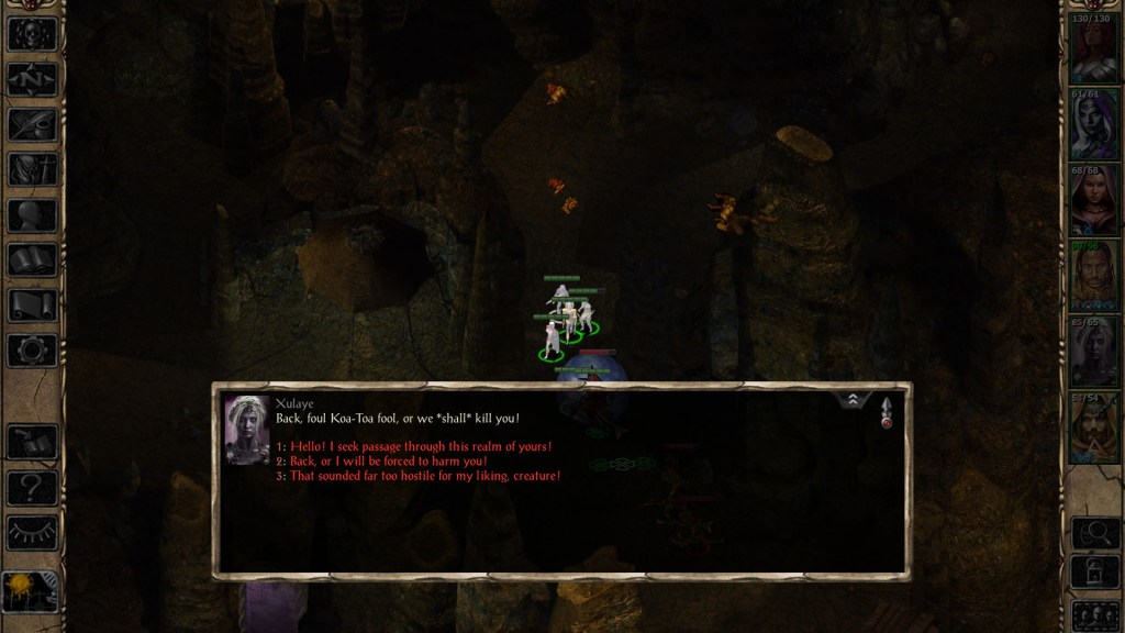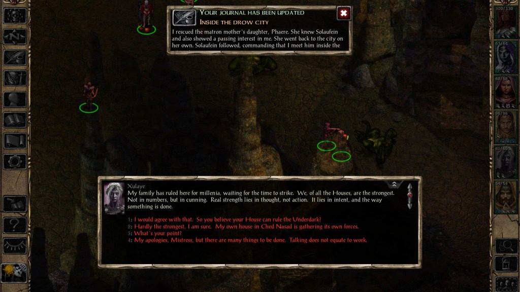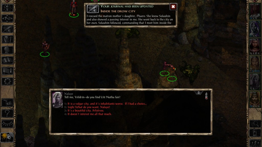 Furthermore, Xulaye won’t comment on the player character taking the “good route” during Phaere’s tasks, nor will she speak up if you reveal your identity to Solaufein — even if you do so before she reveals that she already knows. Having an Ust Natha drow accompany the player through the Underdark would have added even more pressure to stay in character as Veldrin, but there are no consequences for your actions even if you head on in to Adalon’s cave and start chatting with her. Xulaye doesn’t base her knowledge of your true nature on your actions… she just knows.