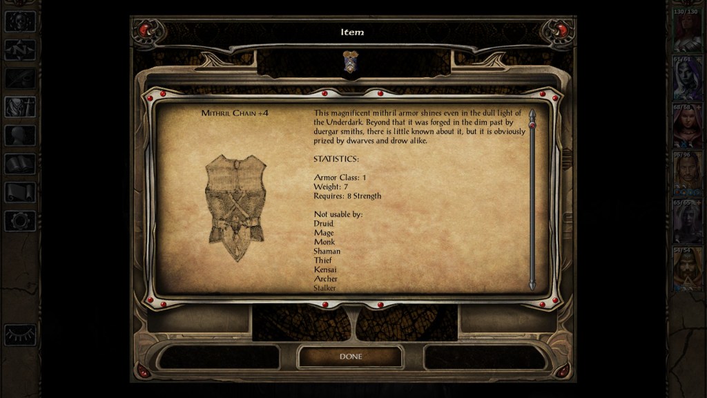 The Mithril Chain +4 is basically the same as Drizzt’s armour, and it allows fighter/thieves and rangers to use their thieving abilities while wearing it. A very nice piece of armour, but not unique to this mod.