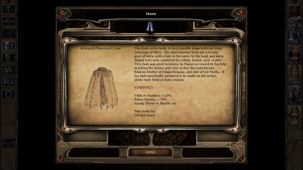 The Piwafwi Cloak is amazing, and will really shine on any character looking to backstab. It’s a pretty basic thieving skill boost with bonus saving throws. Not much else to say here.