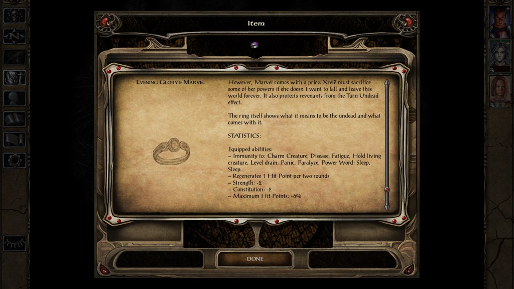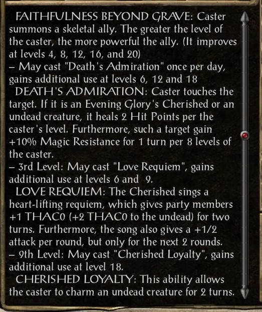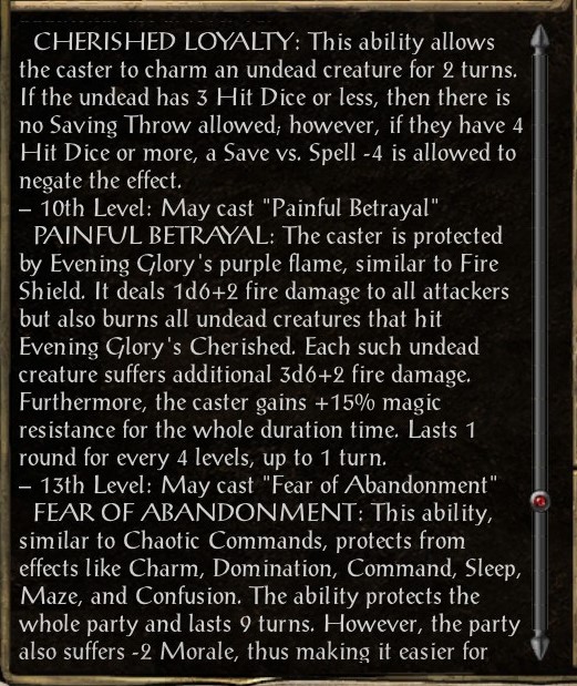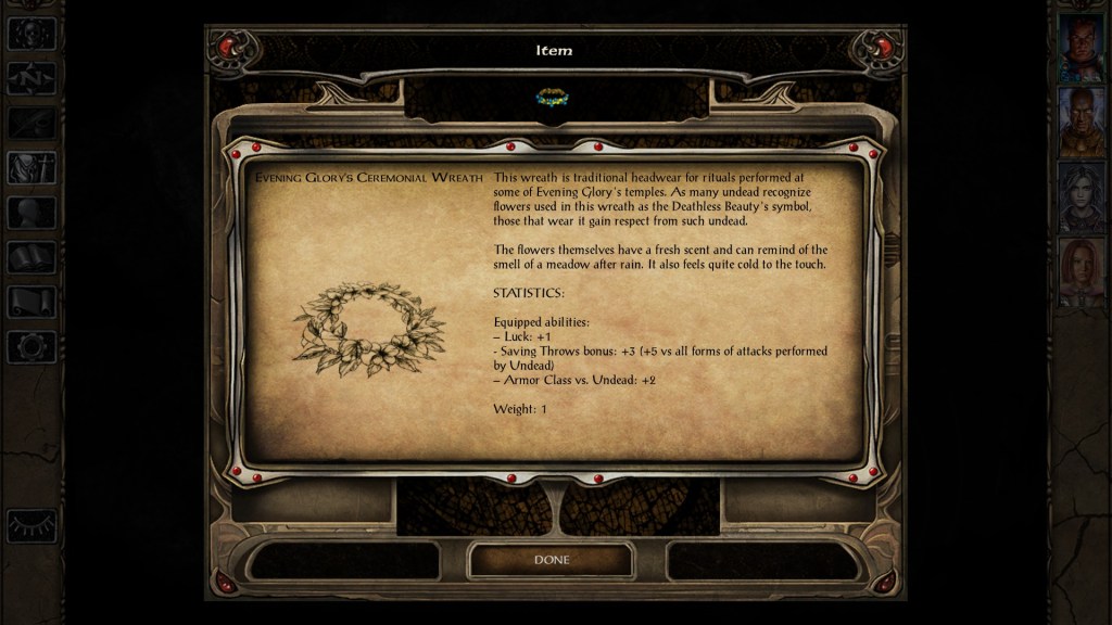 Evening Glory’s Ceremonial Wreath is an interesting item, in that it is incredibly powerful while remaining utterly unique in that it is the only item that will be able to grant you Luck, outside of other mods. Luck, if you don’t know, is a very powerful buff in Baldur’s Gate 1 & 2, and more things can affect it than you may realise. Not only does this item grant Luck, but it also gives you a +3 bonus to all Savings Throws, which becomes a +5 if the caster is undead. There are a LOT of undead spellcasters in BG2, making this an incredibly powerful item.