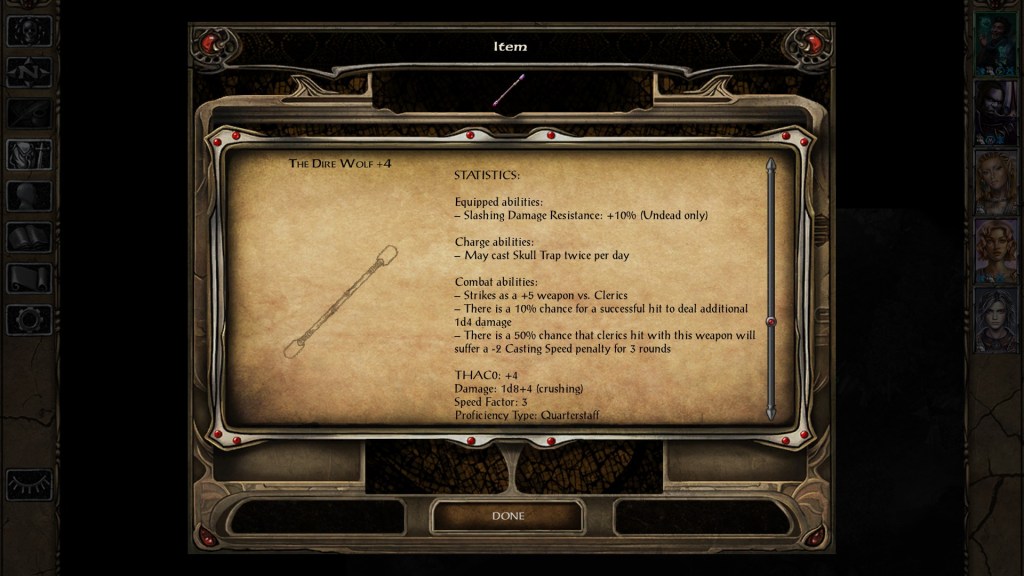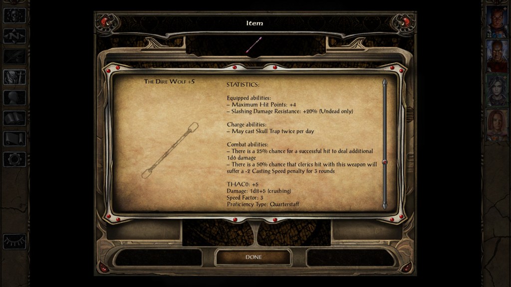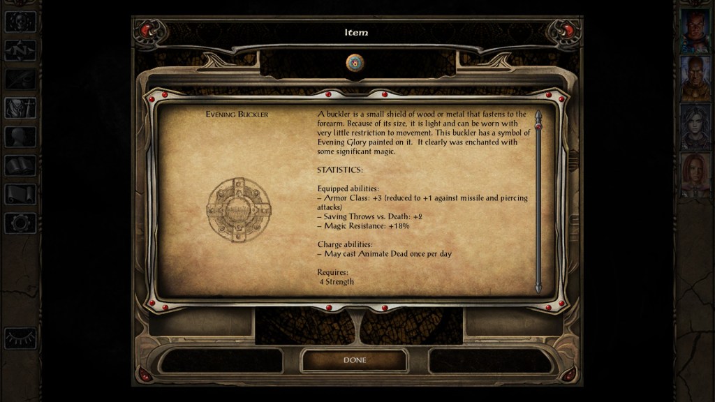 The Evening Buckler is one of my favourite mod items that I’ve played with, as I am a big fan of bucklers. The main problem with being a big fan of bucklers, however, is that they are practically useless in Baldur’s Gate. This buckler grants you +2 Save vs. Death and +18% Magic Resistance, which is fantastic for any character that may find itself holding it. The Evening Buckler has my big smoldering stamp of approval.