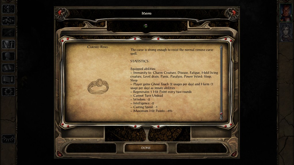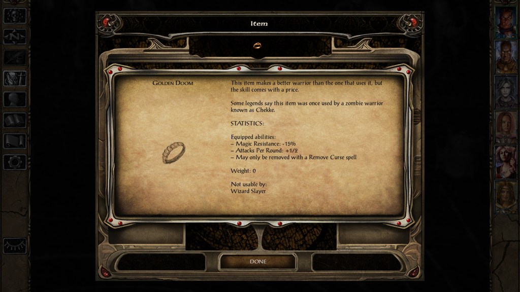 Golden Doom is a ring that offers a very respectable trade of -15% resistance in exchange for an extra 1/2 attack per round. If you have items to mitigate the negative effect of this item and don’t mind not using them optimally, then this would be an excellent item for a character like Haer’Dalis, Minsc, or even Rasaad and Viconia, as their inherent Magic Resistance will counter the -15% of the ring.